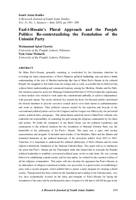 Pdf Fazl I Husain S Plural Approach And The Punjab Politics Re Contextualizing The Foundation Of The Unionist Party Muhammad Iqbal Chawla Academia Edu